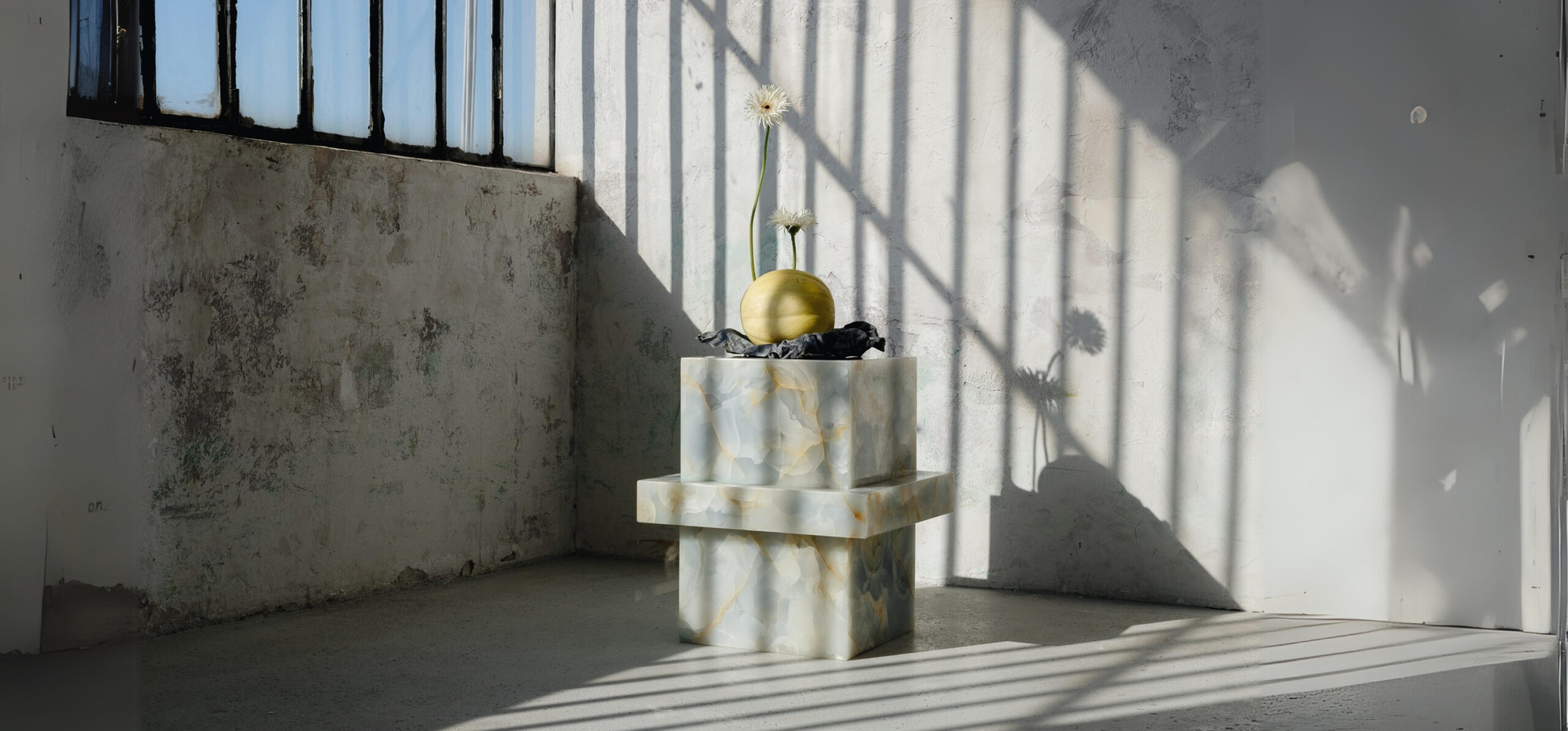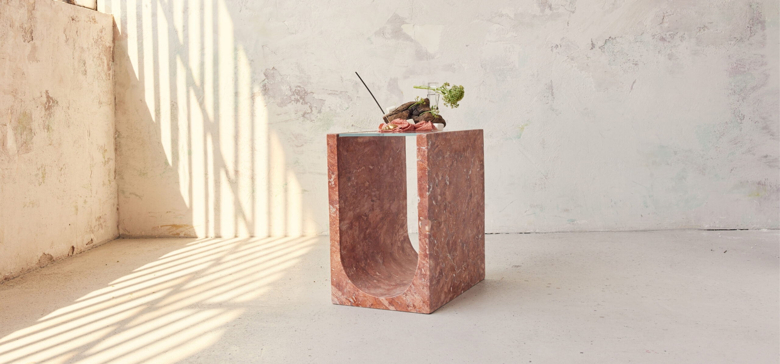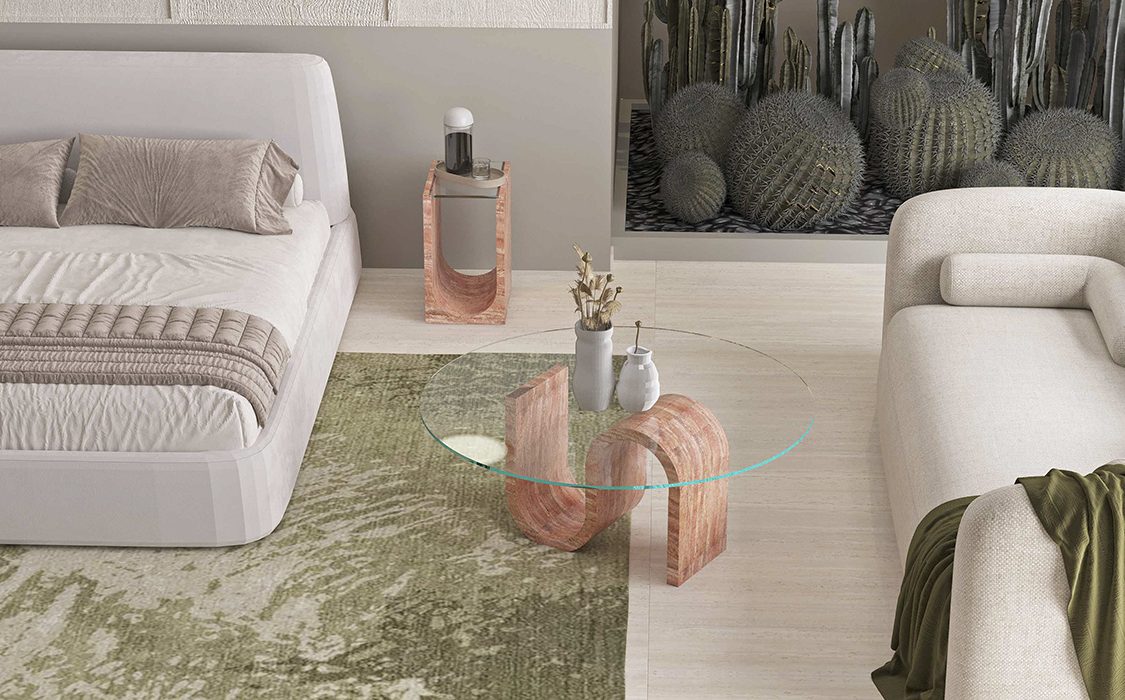 Cam ve mermerin zarif uyumunu sergileyerek hem estetiği hem de işlevselliği ön plana çıkarıyor. Cam, şeffaf bir üst yüzey olarak kullanılırken, tüm zarafetiyle mermer, güzelliğini ortaya koyan ana yapı elemanı olarak hizmet veriyor.