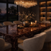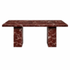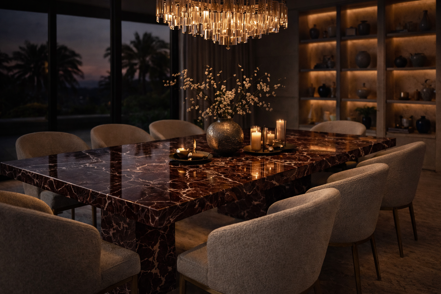 Rectus yemek masası, Elazığ Vişne mermerinin derin bordo tonları ve yüzeyi saran beyaz damarların güçlü kontrastıyla, dengeli ve karakterli bir kompozisyon sunar. Doğal desenlerin yüzeyde oluşturduğu hareket, ışıkla birlikte farklılaşarak mekâna sıcak ve sofistike bir atmosfer kazandırır.