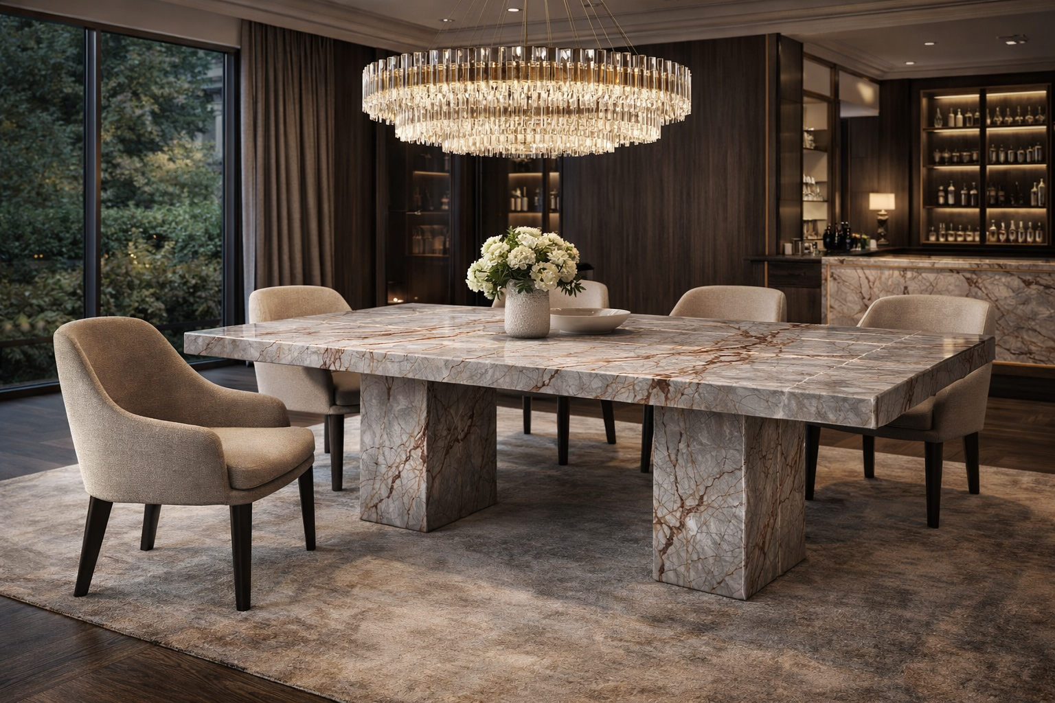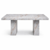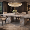 Rectus yemek masası, Grey Harmony taşının açık gri tonları ve yüzey boyunca ince, kırılgan bir ağ gibi yayılan damar yapısıyla, dengeli ve zarif bir kompozisyon sunar. Doğal çizgilerin oluşturduğu hareket, ışıkla birlikte yumuşak geçişler yaratarak mekâna ferah ve sofistike bir atmosfer kazandırır.