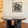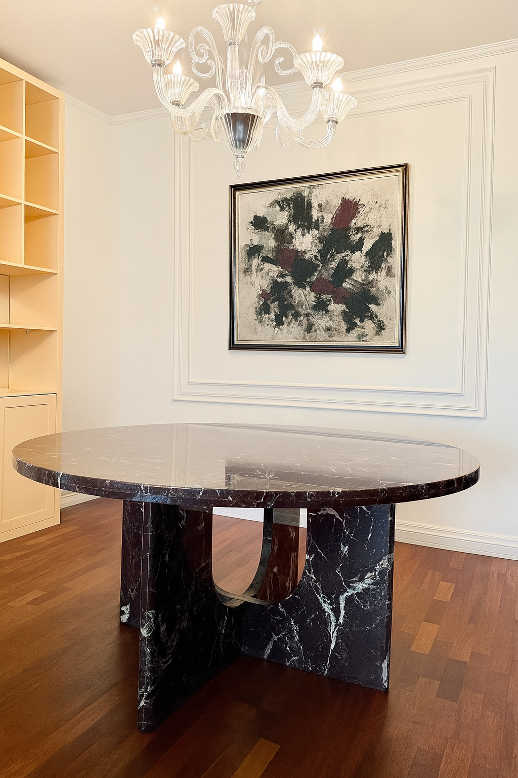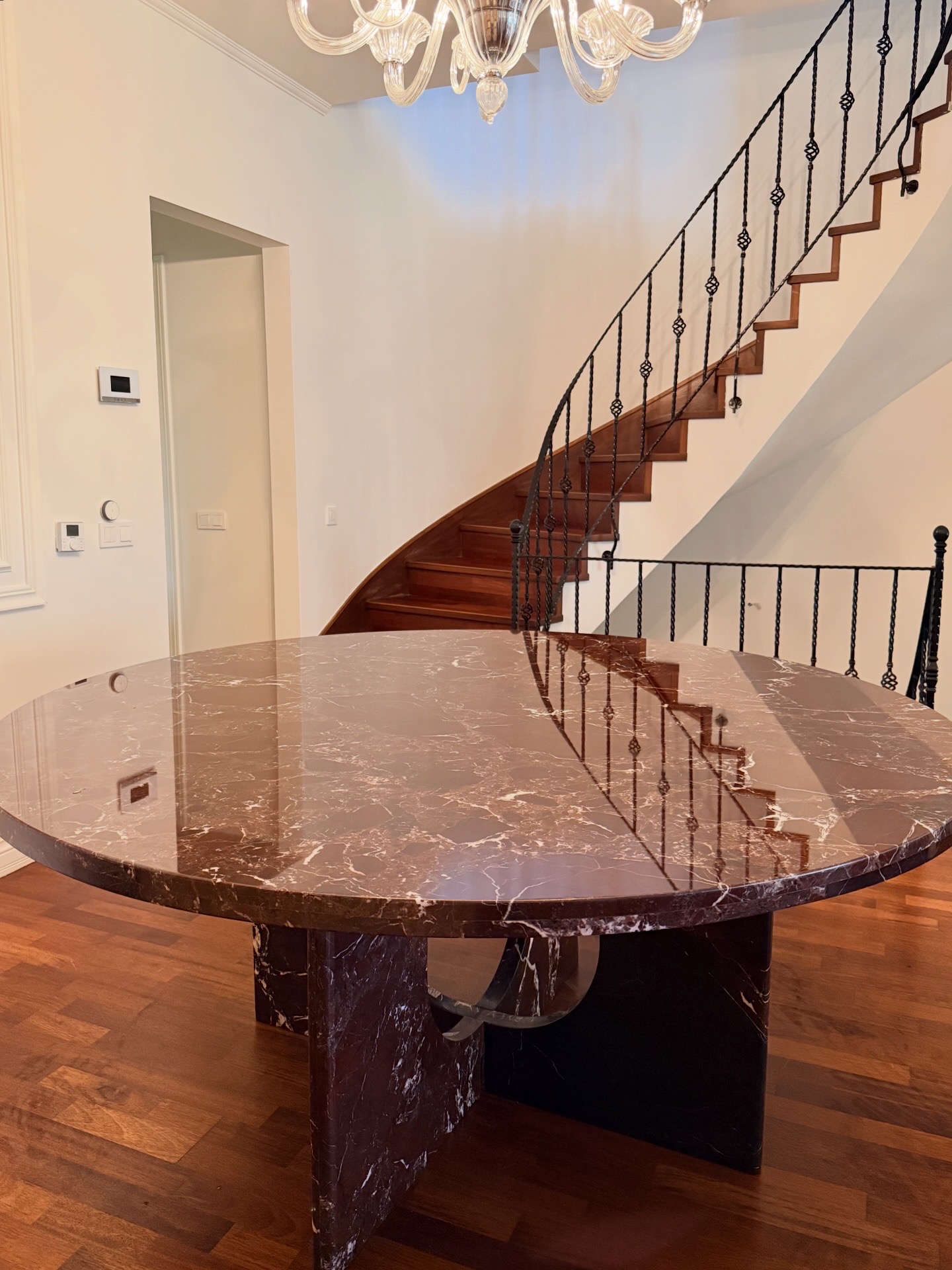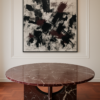 Crimson yemek masası, derin bordo tonların mermerin doğal damarlarıyla kesiştiği kompozisyonu, rengin ve formun dengeli bir birlikteliğiyle sunar. Bordo yüzeyler; mekânda güçlü ama ölçülü bir ritim yaratır.